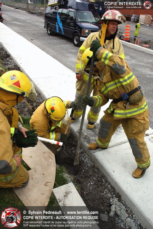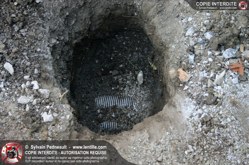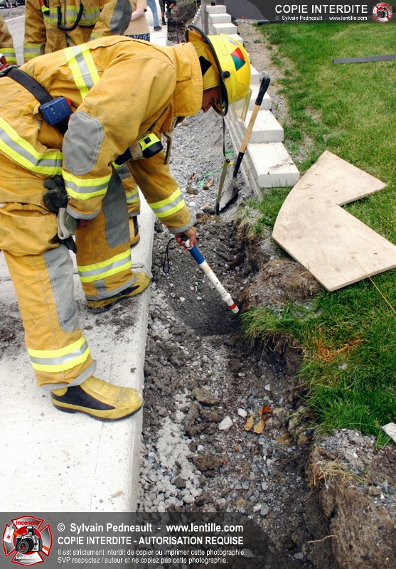 En installant les poteaux d'une clôture, des travailleurs percent un câble électrique sous-terrain, causant un court-circuit et provoquant quelques flammes.